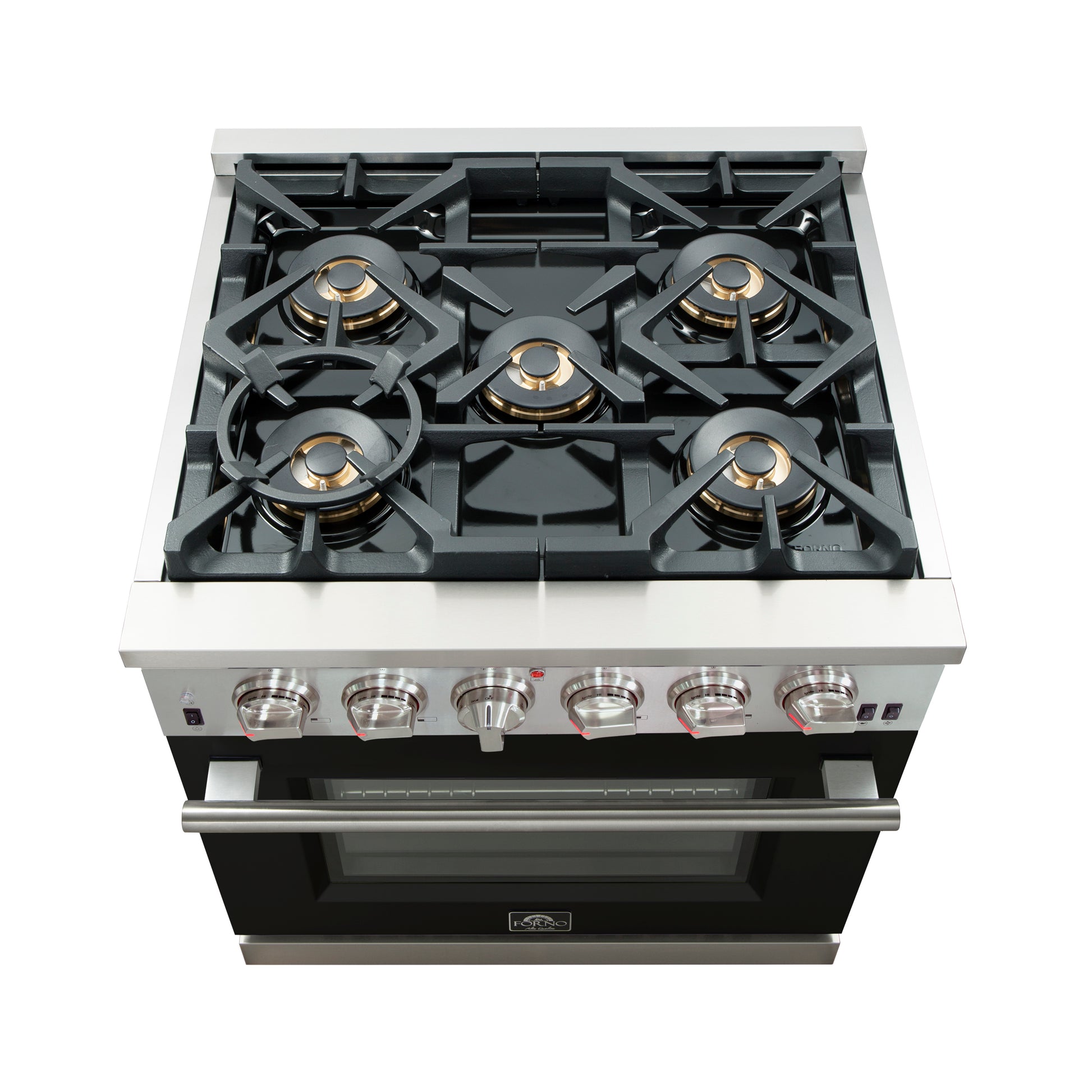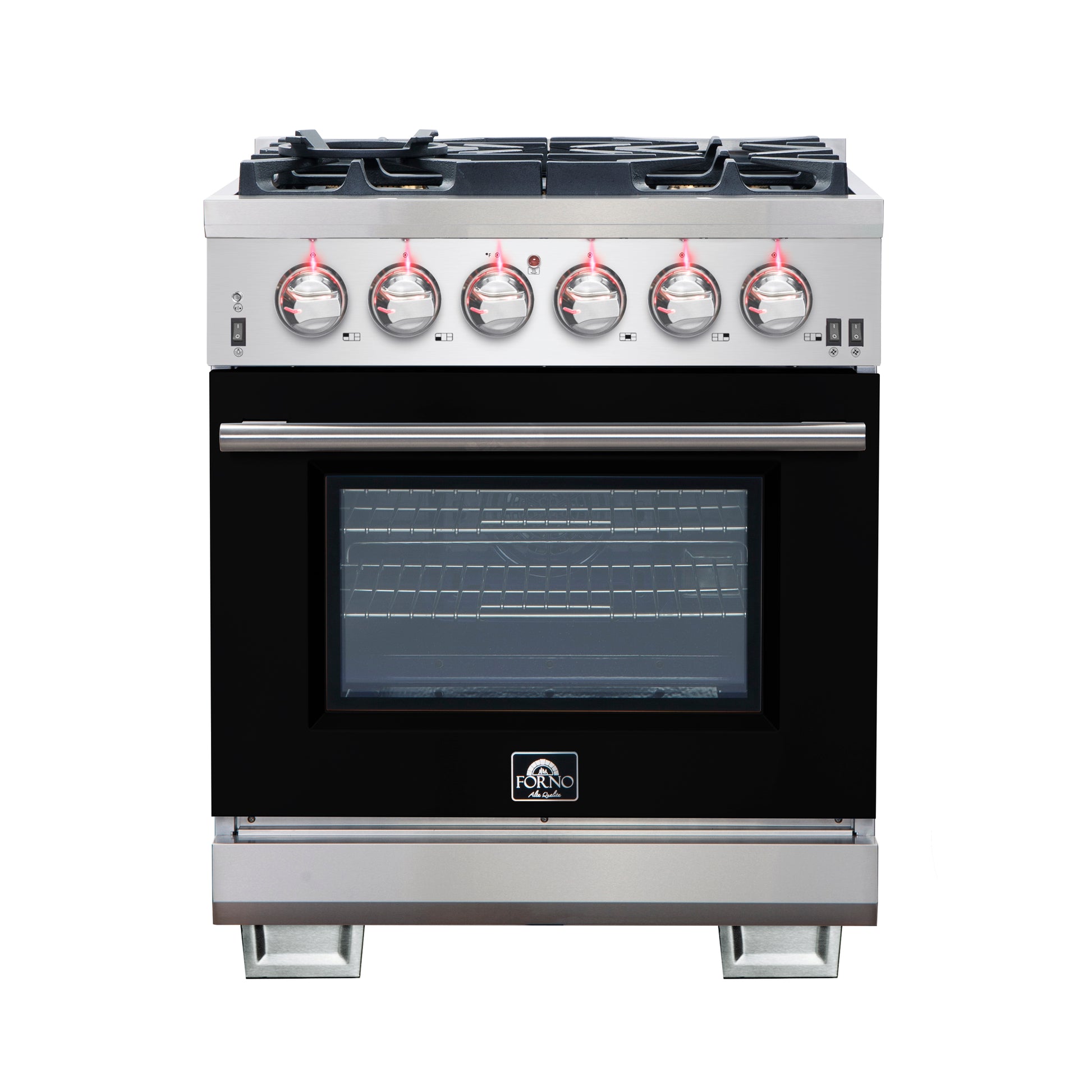 Forno Capriasca 30-Inch Freestanding Gas Range, 4 Burners, True Convection Oven, Black Door