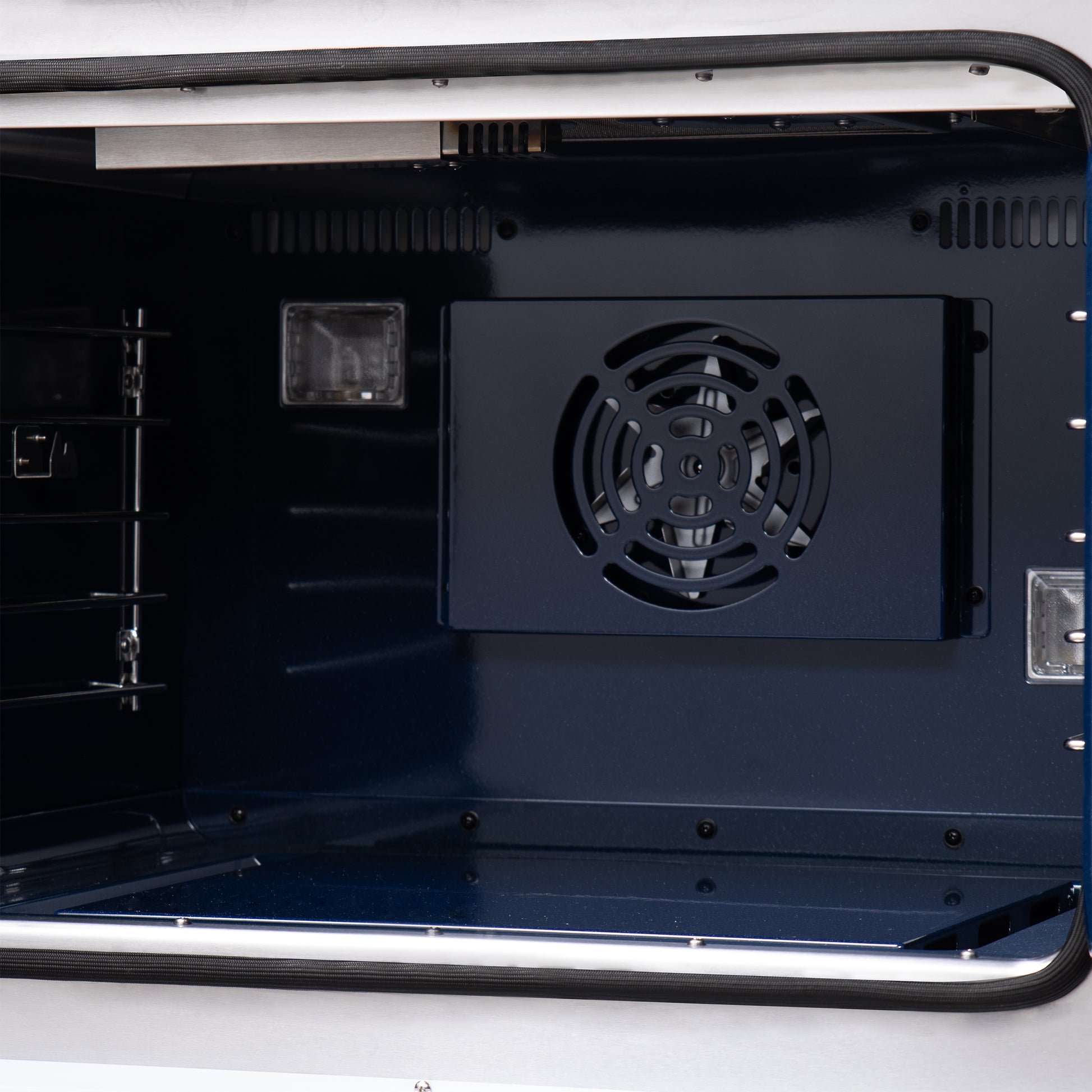 * The speckled blue enamel oven, of 5.36 cu.ft. features a switch-activated convection fan with a total output of 30,000 BTU.