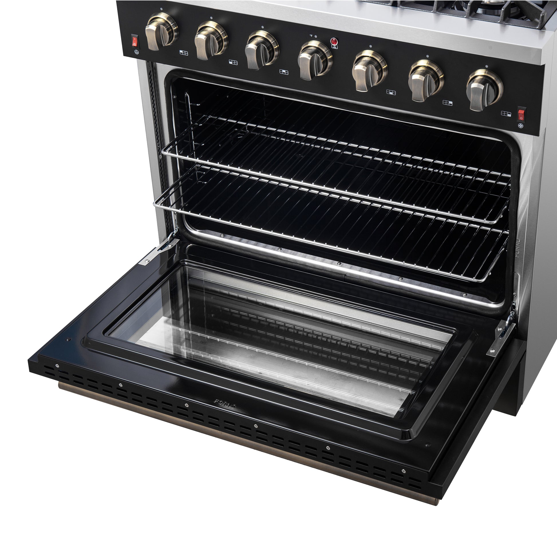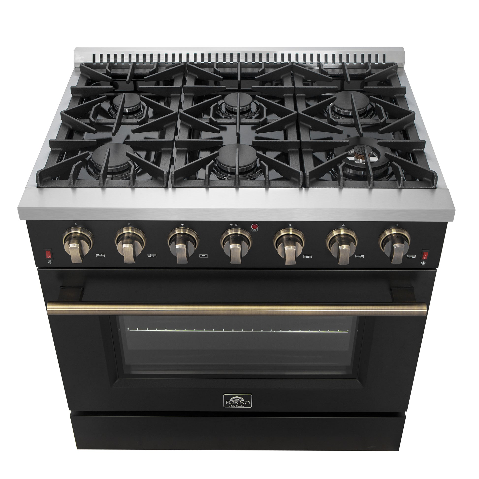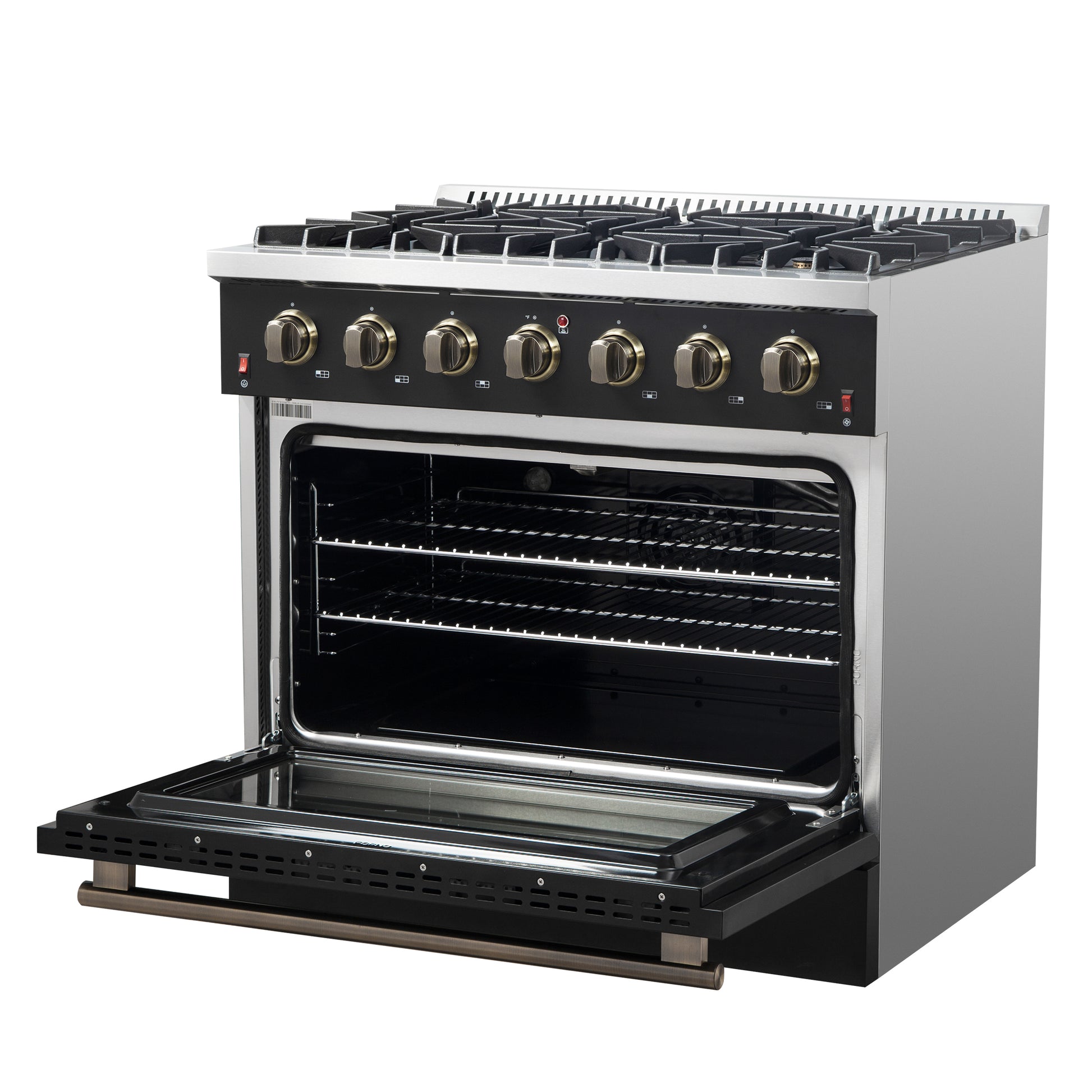 Forno Galiano 36-inch Freestanding Gas Range in Black with Antique Brass Design, 6 Burners, 83,000 BTU, 5.36 cu.ft. Convection Oven