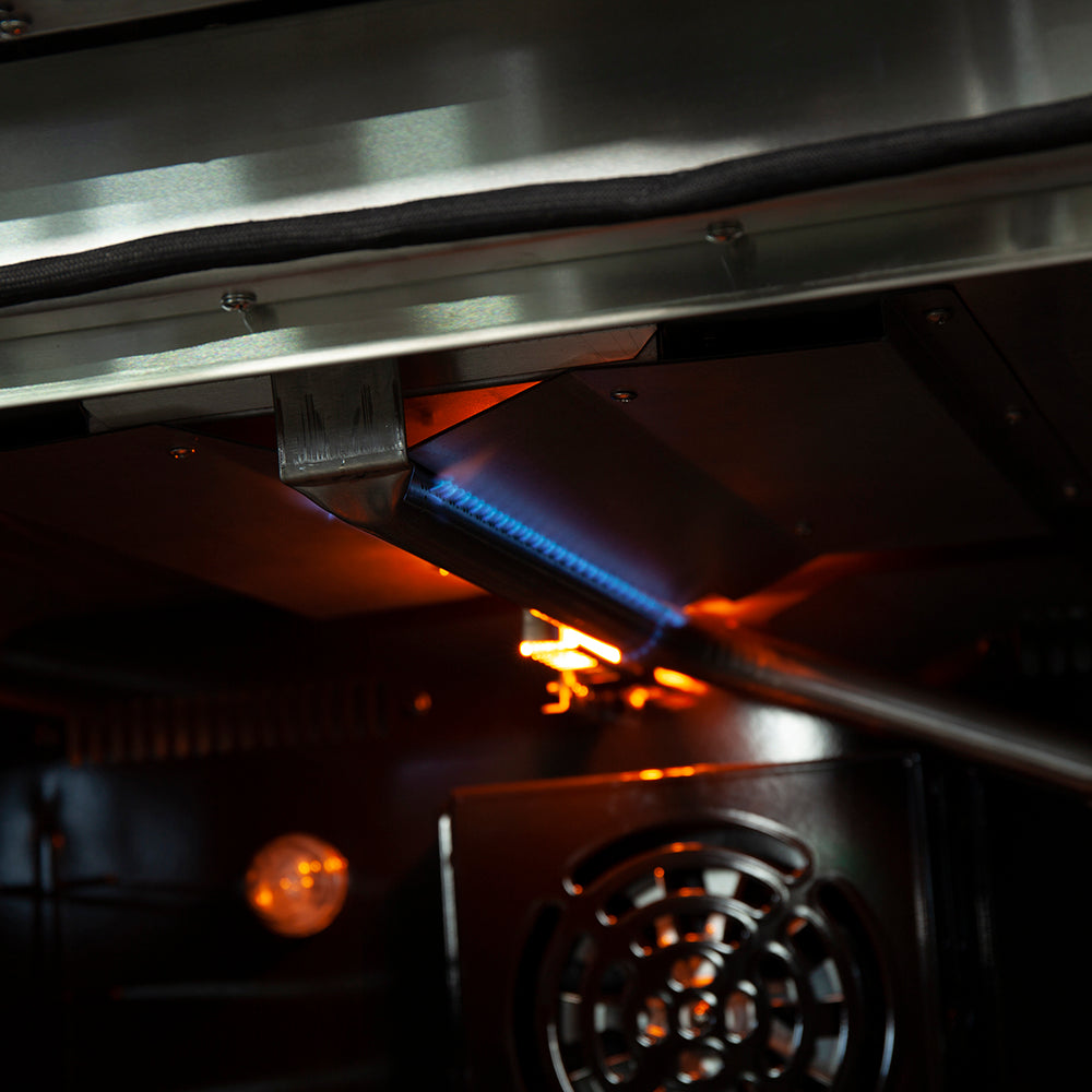 * Continuous cast iron grates provide stability and ensure smooth cookware movement across the surface.
