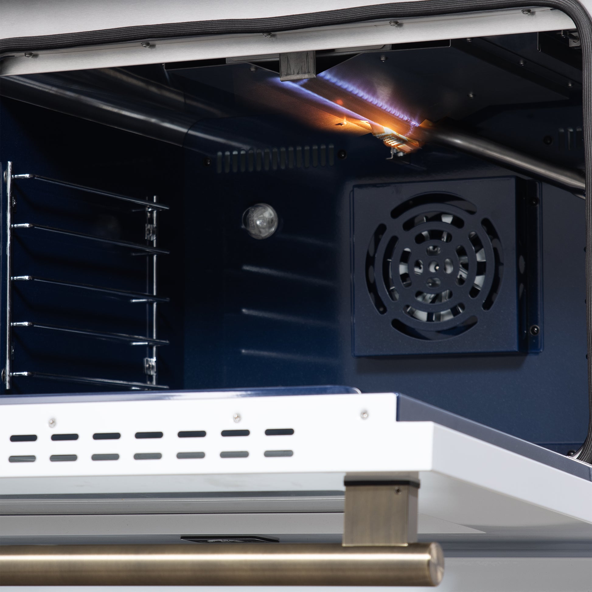 * Speckled blue enamel oven of 4.32 Cu.Ft with convection fan & 30,000 BTU Total Broil and Bake output